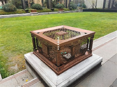 材质:不锈钢景墙、铜灯、铜门、铜树池